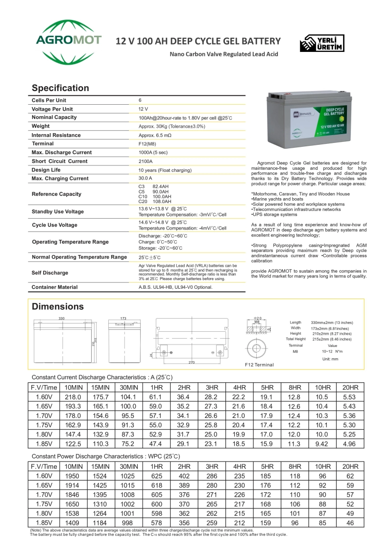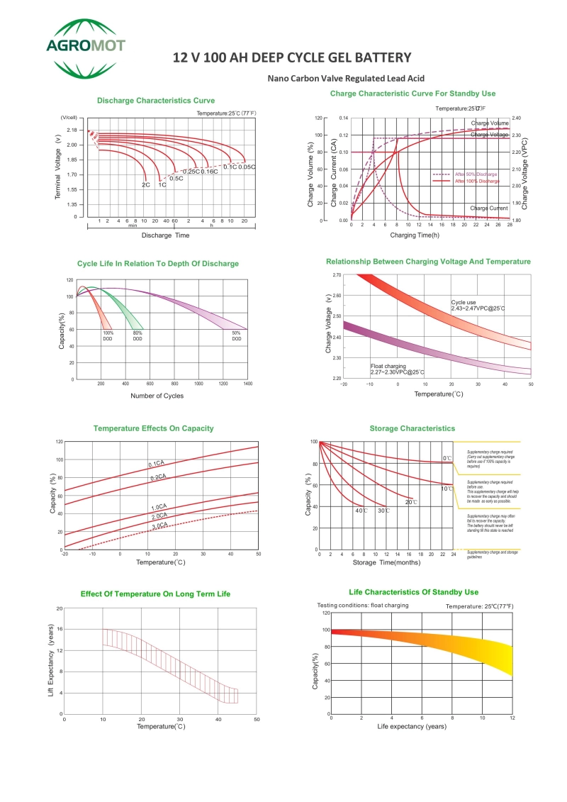 Yüksek performans ve derin deşarja uygun proseslerde üretilen Agromot JEL Aküler Nano Carbon teknolojisi sayesinden daha verimli bir kapasite ve voltaj aralığına olanak vermektedir. Solar sistemlerin entegrasyonuna en uygun şekilde kullanılabileceği gibi enerji depolama konusunda mevcut akülere göre daha yüksek bir uyum sağladığı kanıtlanmıştır. Karavan, Tiny House, Wooden House gibi döngünün yüksek olduğu yerlerde başlıca tercih sebebi olarak kullanılmaktadır.