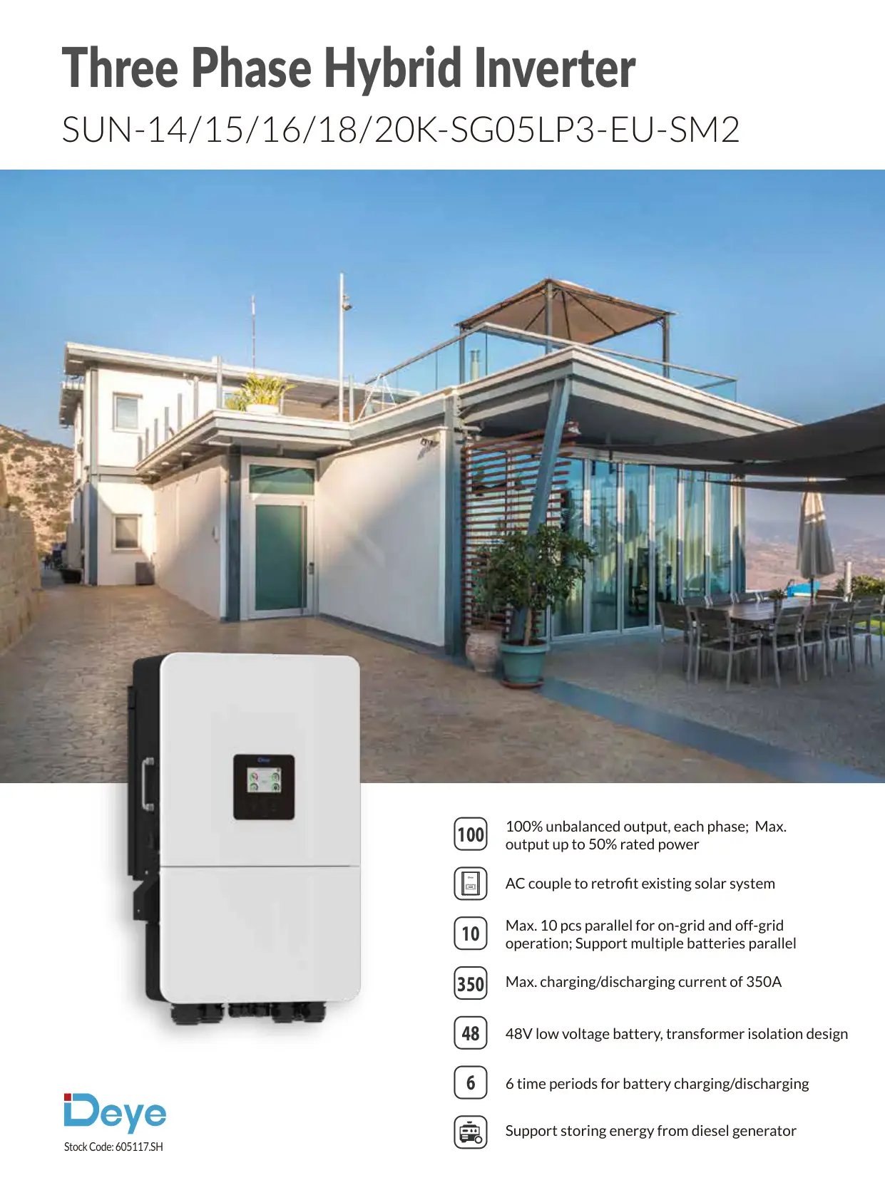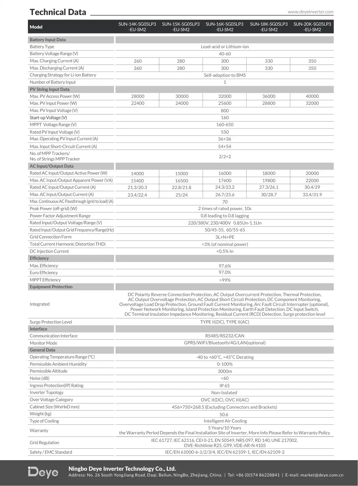 Deye SUN-15K-SG05LP3-EU-SM2, yüksek verimlilik, geniş depolama uyumluluğu ve ileri seviye hibrit çalışma özellikleriyle ticari ve konut enerji sistemleri için geliştirilmiş profesyonel bir çözümdür. 48V düşük voltajlı batarya altyapısı sayesinde güvenli, uzun ömürlü ve yüksek performanslı enerji depolama imkanı sunarken, aynı zamanda güçlü MPPT yapısı ile maksimum güneş enerjisi üretimini sağlar.
