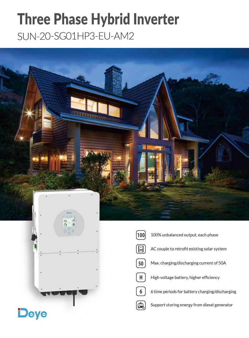 Bu model, tam trifaze hibrit yapı, 100% faz dengesiz yük desteği, AC coupling özelliği ve 6 zaman periyodu ile şarj/deşarj programlama fonksiyonlarına sahiptir. Deye’nin gelişmiş yazılım ve donanım mimarisi, kesintisiz enerji yönetimi ve yüksek verimlilik sunarak sistem performansını maksimum düzeye çıkarır.