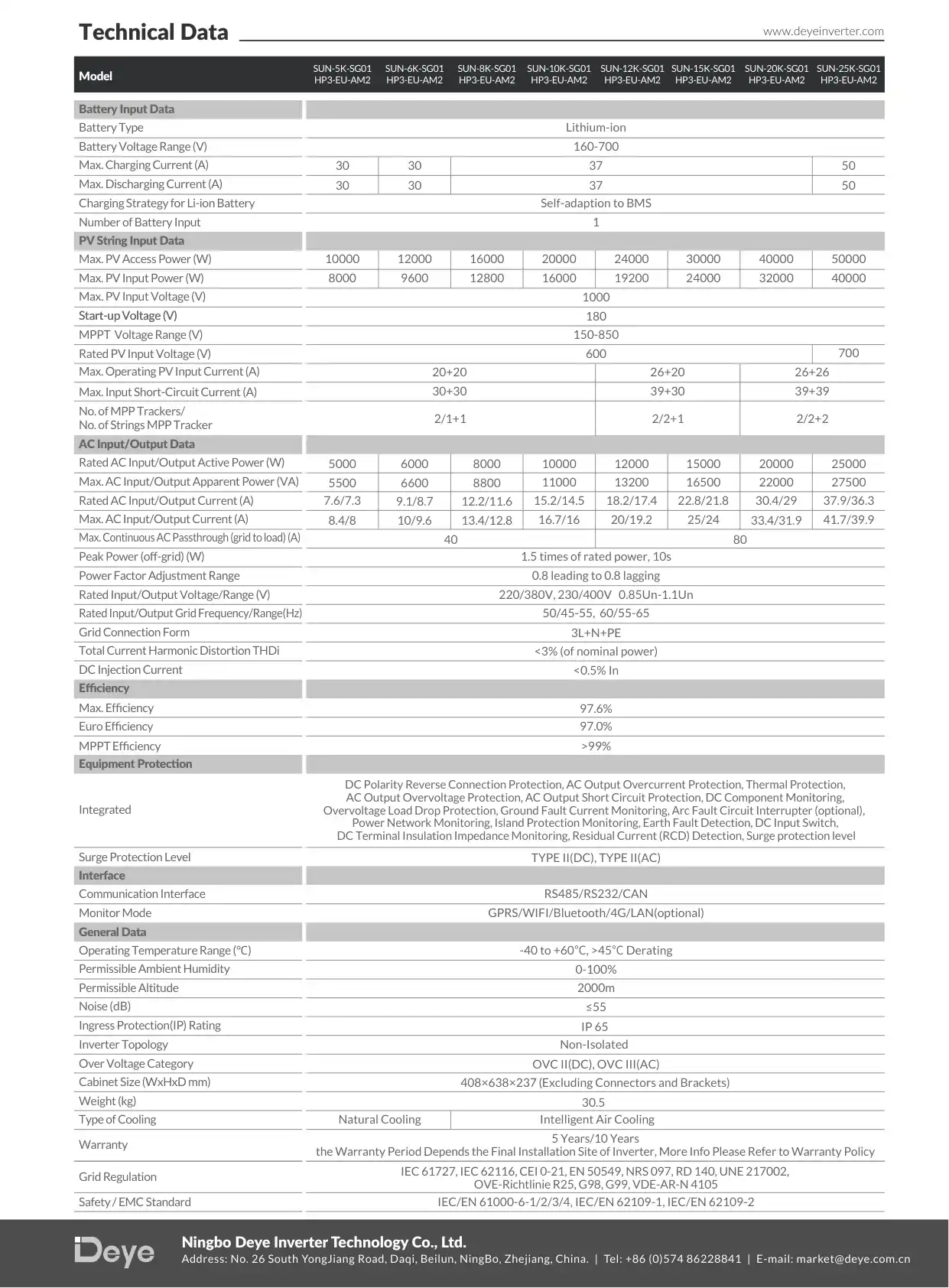 Deye 20 kW Trifaze HV Hibrit İnverter - Teknik Özellikler