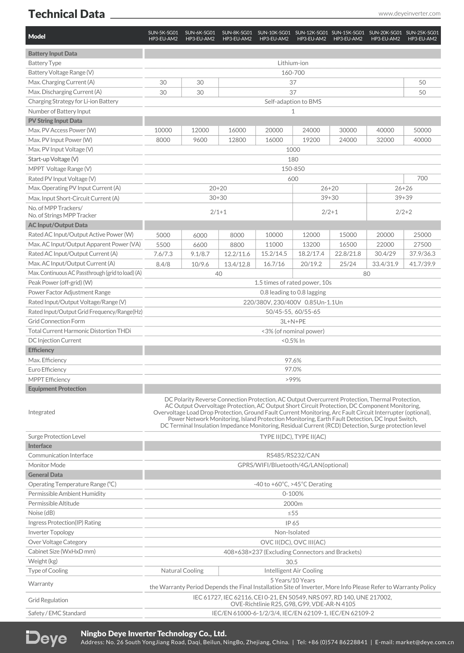 Deye’nin ileri inverter teknolojisi, yüksek dayanıklılık, düşük harmonik distorsiyon, endüstriyel kullanım koşullarında güvenilir performans ve akıllı koruma algoritmaları ile birleştirilmiştir. SUN-25K-SG01HP3-EU-AM2 modeli, 5 yıl garanti ile sunulmakta olup kurulum şartlarına bağlı olarak garanti süresi 10 yıla kadar uzatılabilir.
