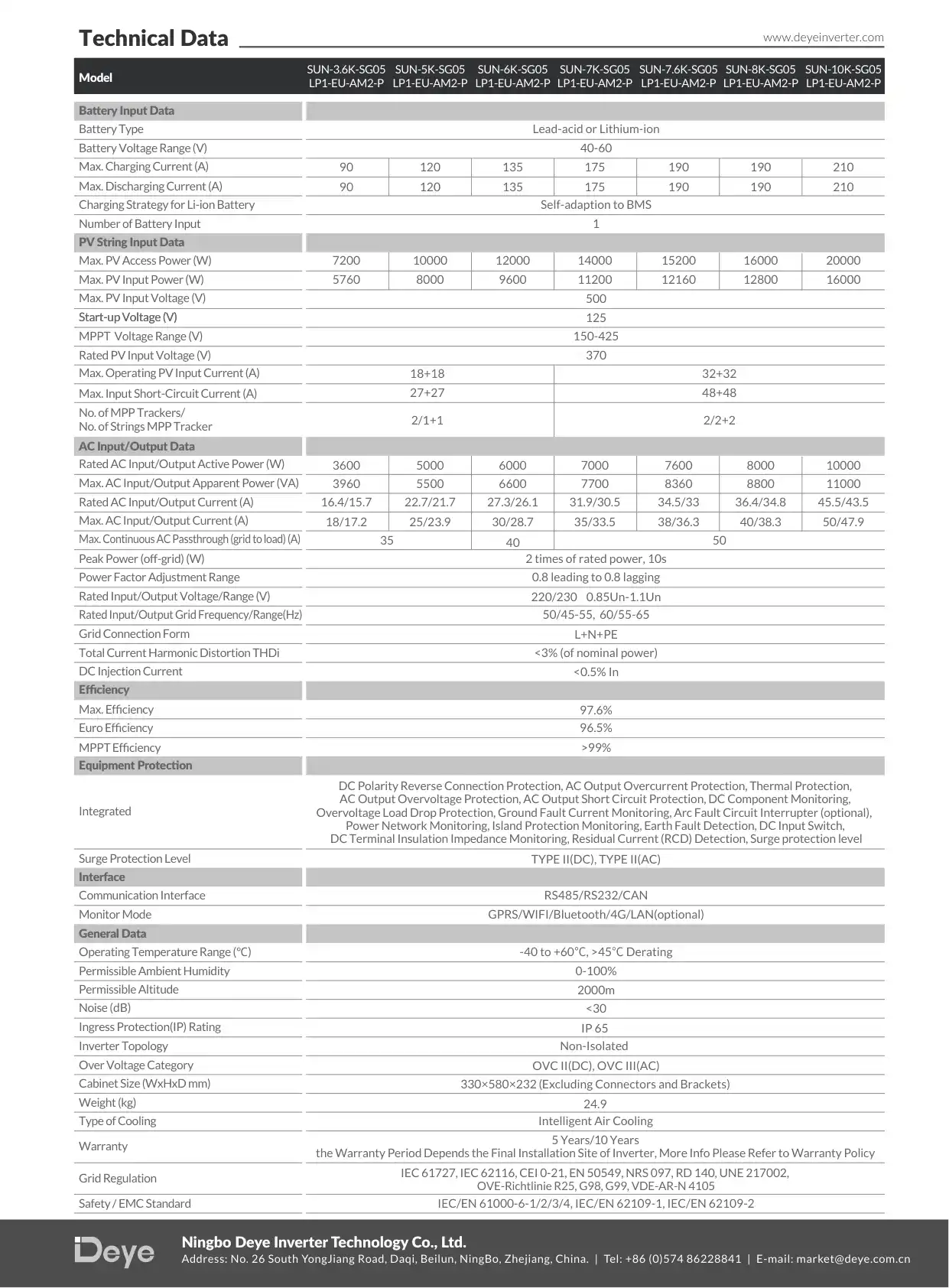 Deye SUN-8K-SG05LP1-EU-AM2-P, konut tipi enerji depolama çözümlerinde yüksek verimlilik, güvenlik ve esneklik arayan kullanıcılar için geliştirilmiş yeni nesil hibrit inverterdir. Monofaze yapısı ve geniş MPPT aralığı sayesinde hem yeni kurulumlarda hem de mevcut güneş enerjisi sistemlerinin modernizasyonunda mükemmel uyumluluk sunar.